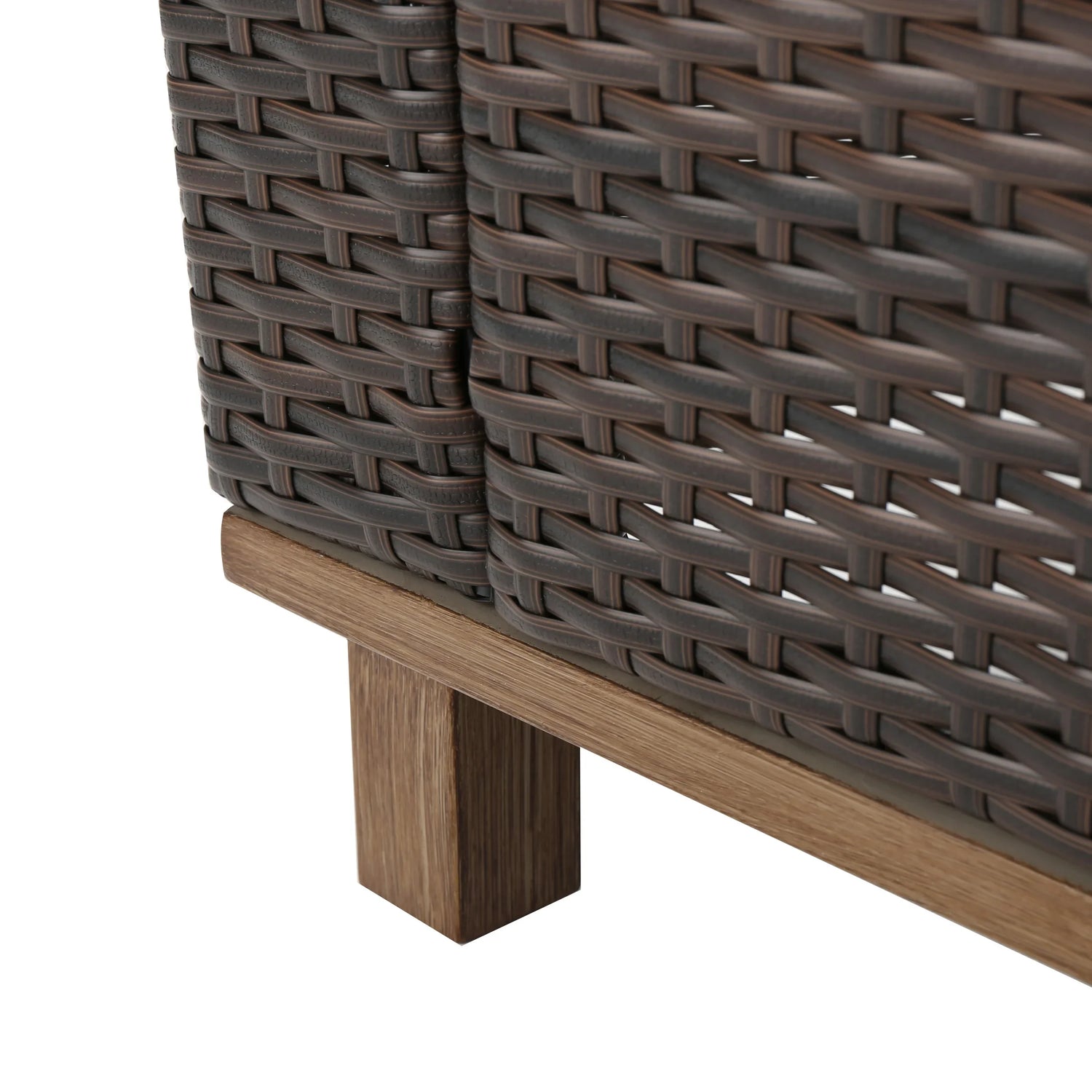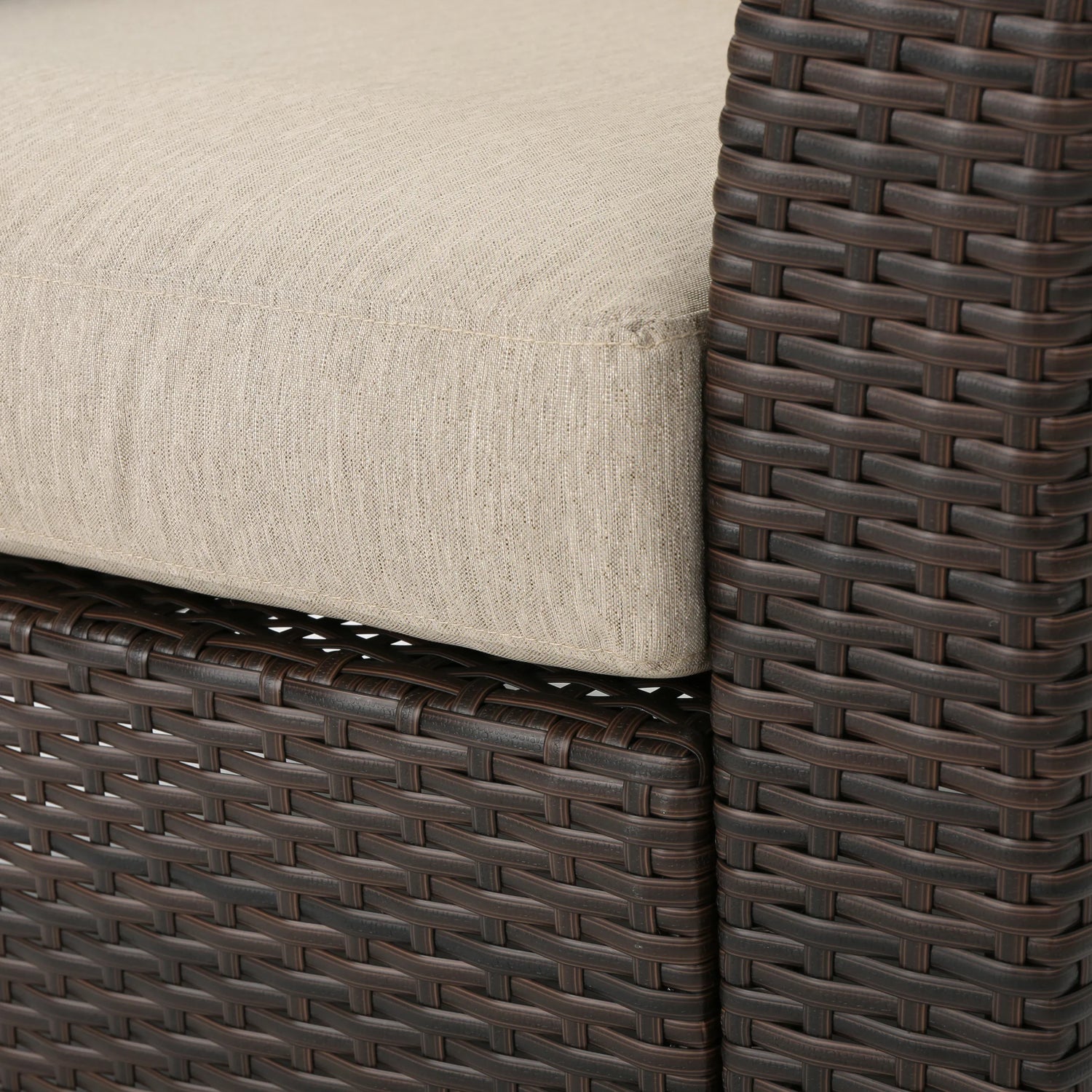 Finish & color: Brown synthetic rattan with neutral tan cushion fabric—warm, earthy undertones. Natural materials and outdoor lighting can produce slight color variation.