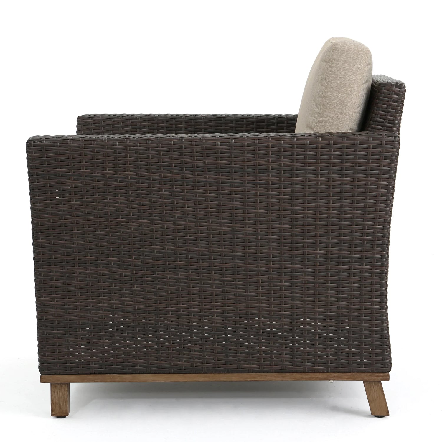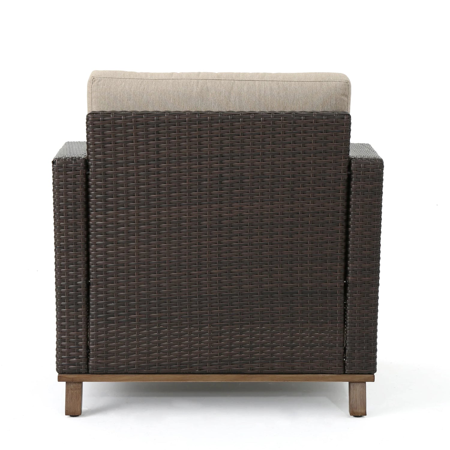 Durable PE rattan wraps a powder‑coated iron frame for lasting structure, while waterproof outdoor fabric cushions provide soft, low‑maintenance seating. The warm brown weave and neutral tan cushions shown bring natural, earthy tones to the patio; note that colors may vary slightly between screens and natural materials. These chairs are styled to feel like classic club chairs but built specifically for outdoor use.
