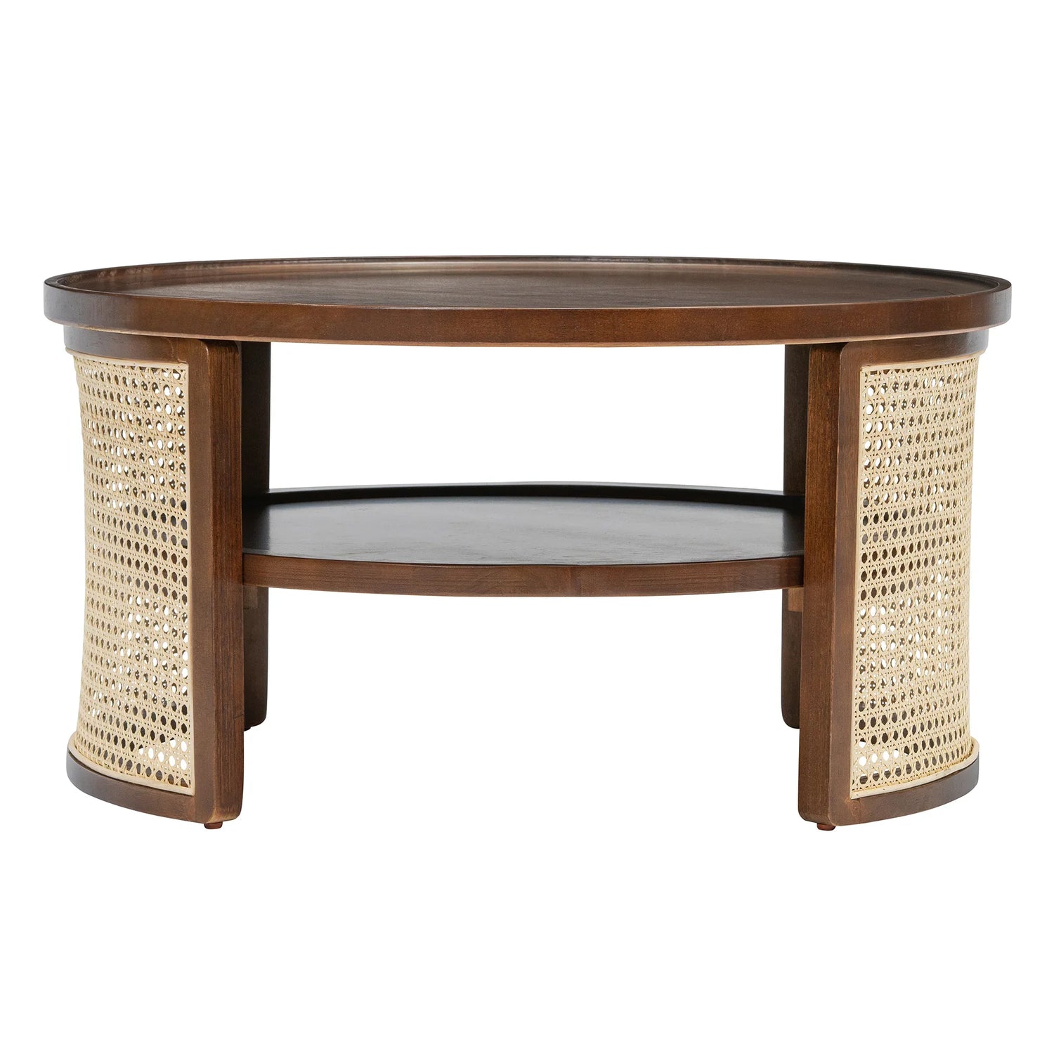 2-Tiered Round Walnut Wood Coffee Table with Storage Rattan Base in 31.3''