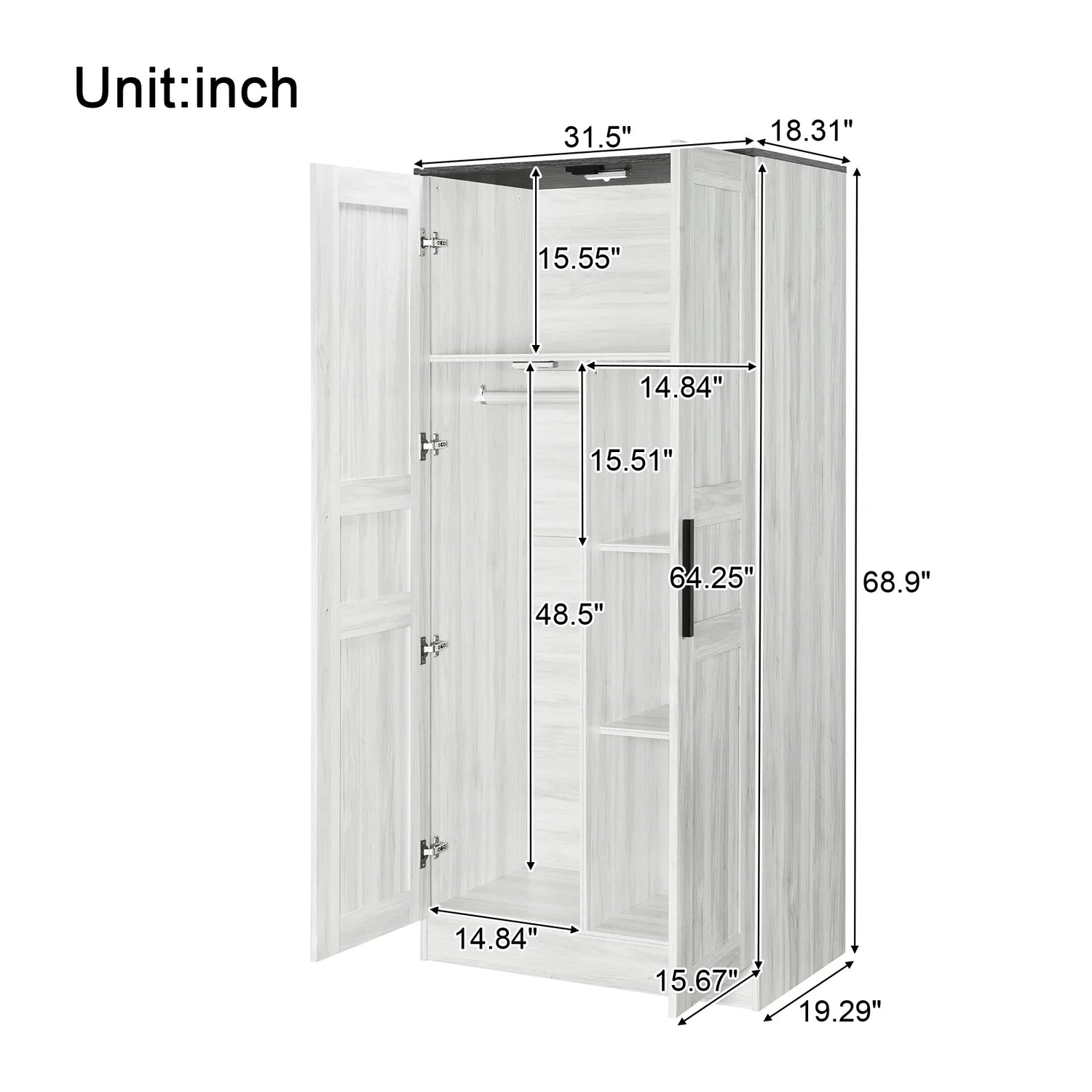 2-Door Wooden Wardrobe Armoire with LED and 4 Storage Shelves, Grey