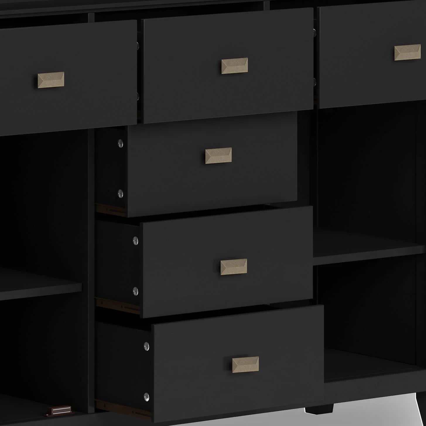 - Features six (6) central drawers with metal glides, and two (2) side doors with tempered glass that open to large storage spaces with one (1) shelf each.