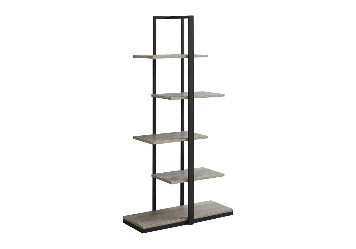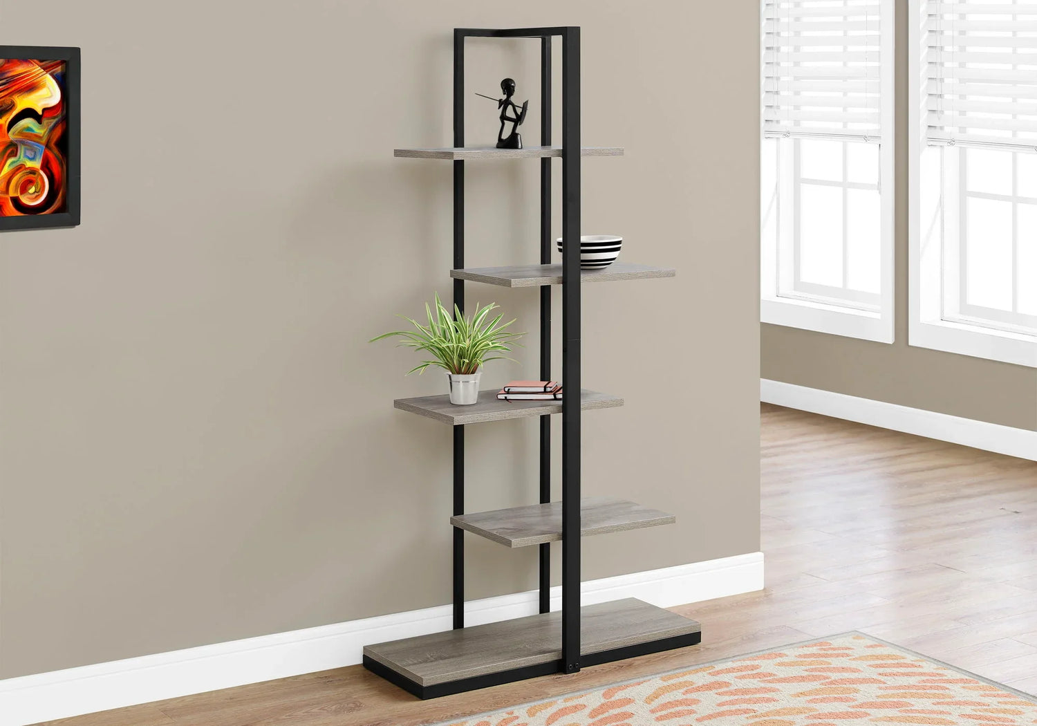 Built around a slim open frame, the design balances airy display with practical load‑bearing shelves. The black metal uprights and wood‑look shelving (visible in product images) create a modern, mixed‑material look that pairs equally well with contemporary, industrial, and transitional interiors. Shelves appear staggered to offer varied display heights for tall vases, stacked books, and framed photos.