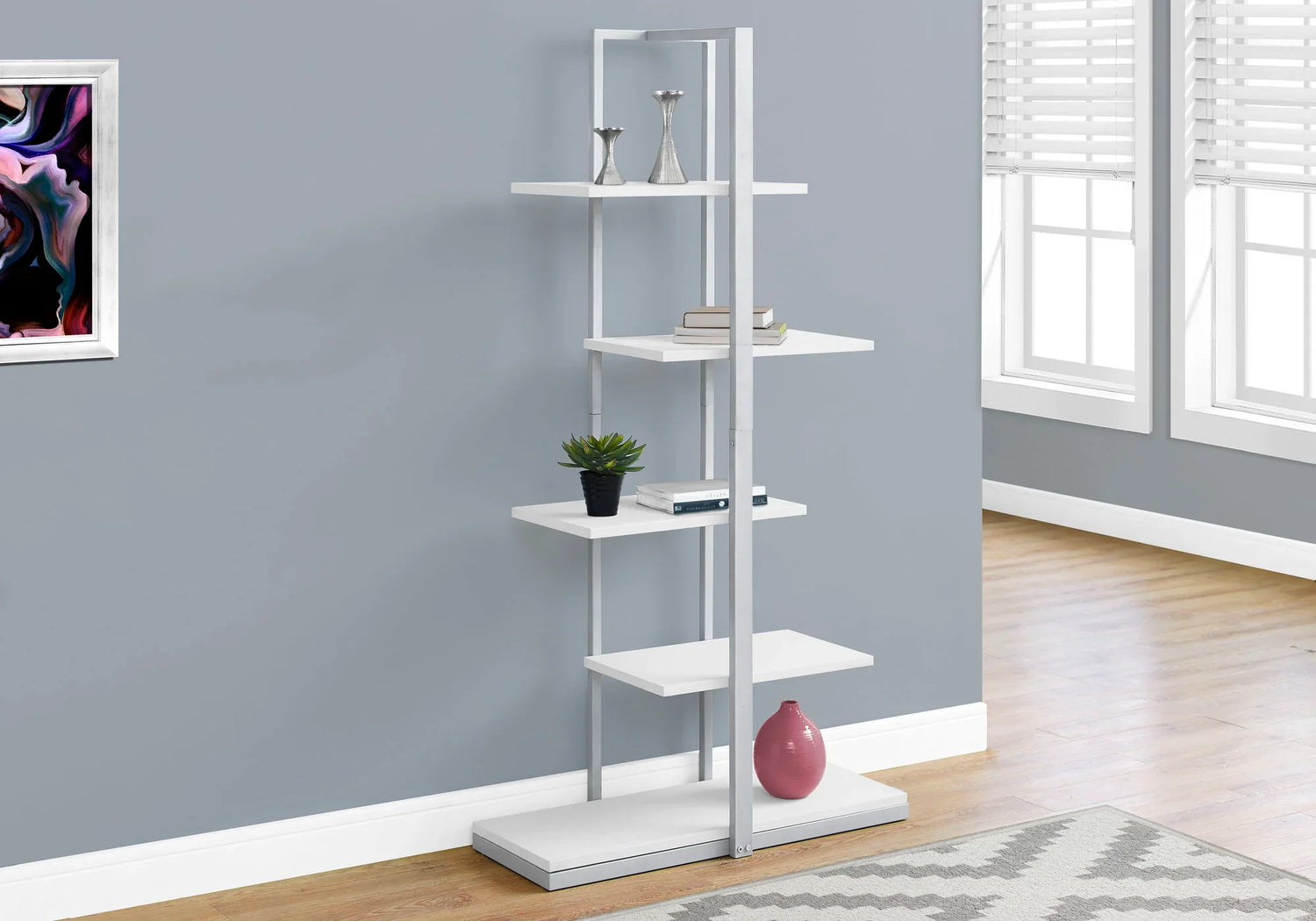 A sculptural storage piece for small spaces, this 5‑shelf etagere is made for renters, apartment dwellers, and home office setups that need standout style without a heavy footprint. The asymmetrical, zig‑zag shelving draws the eye while keeping books, plants, and decorative objects organized and visible — perfect for an entryway, living‑room corner, or compact workspace.