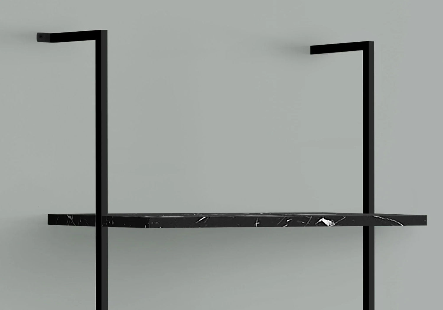 Finish & color notes: Matte black frame with pale marble-look shelf tops — cool gray undertones on the shelving. Natural variation in texture and monitor settings may cause slight differences in appearance.