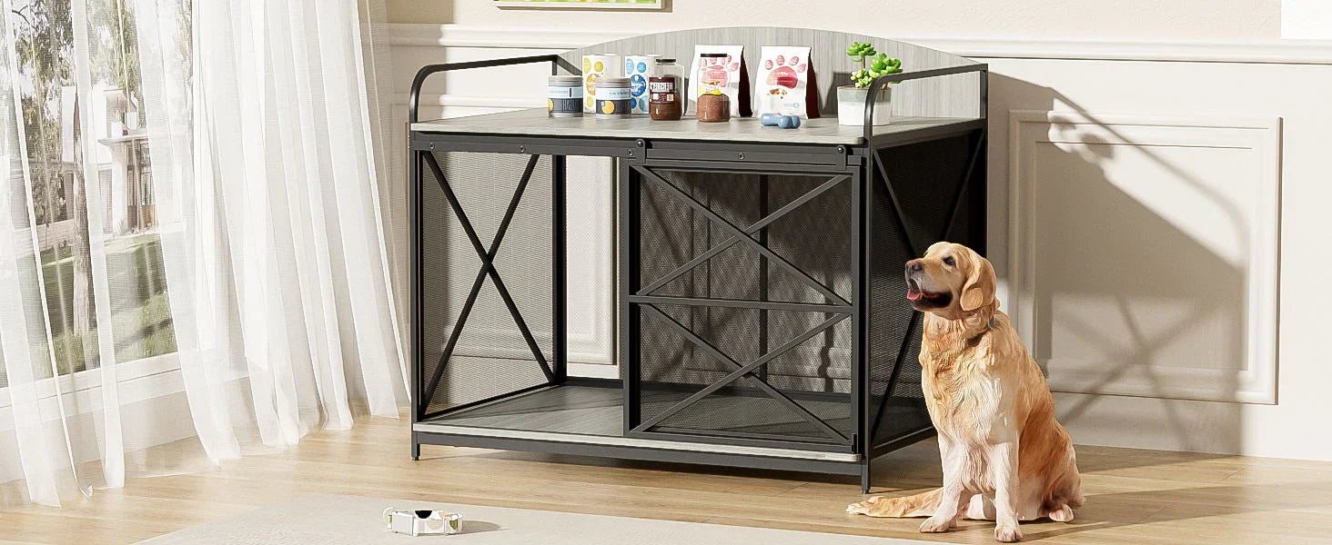 - Practical Features: The kennel features a spacious desktop with a curved back panel to store pet supplies and personal items securely. The unique sliding barn door design ensures easy access for dogs and includes a lock for added safety, making it ideal for compact spaces.