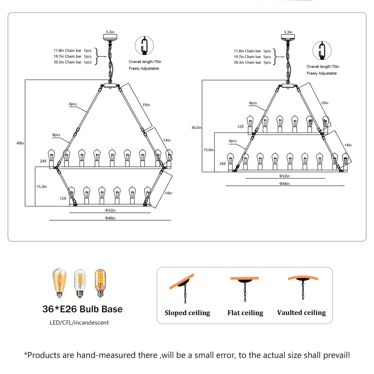 - Bulbs: Requires 36 bulbs (not included). The open-socket design works well with vintage Edison or LED bulbs—confirm socket/base type in technical specs before purchase.