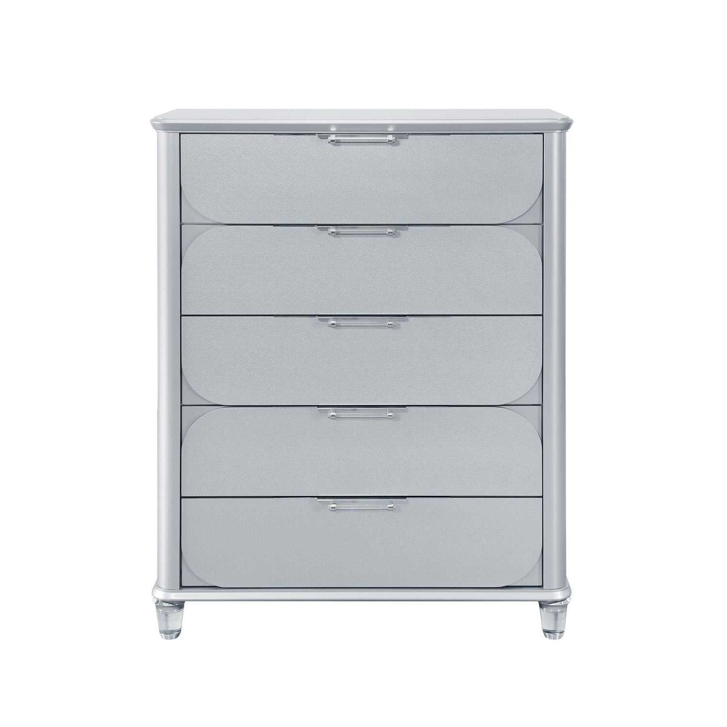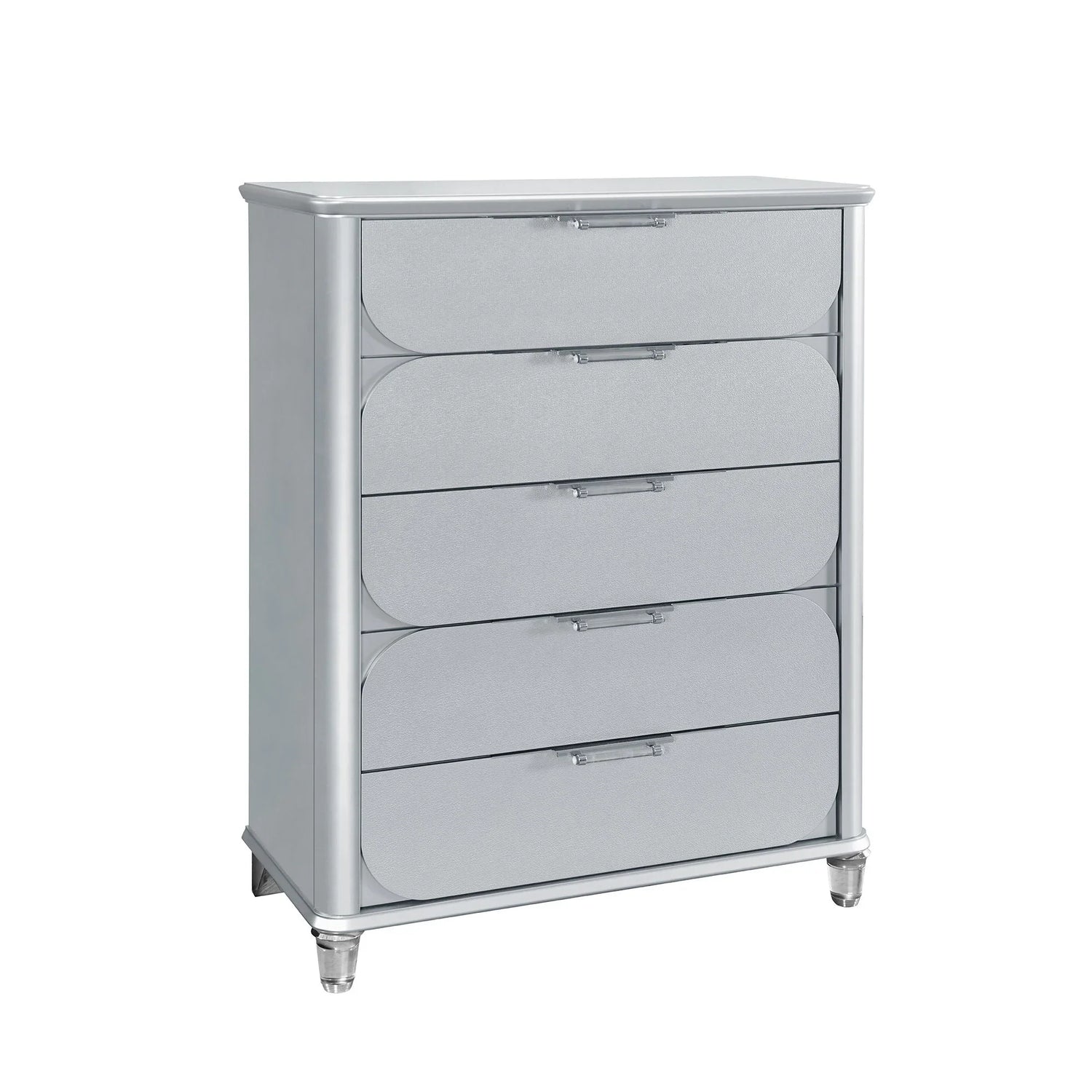 Everyday use is effortless: smooth-front drawers with sleek pull hardware keep clothing and linens organized, while the bun-style feet and clear acrylic front legs lift the piece with lightness and visual interest. The silver-tone finish and soft rounded drawer fronts create a modern, elegant look that complements metallic accents, mirrored furniture, and neutral linens.