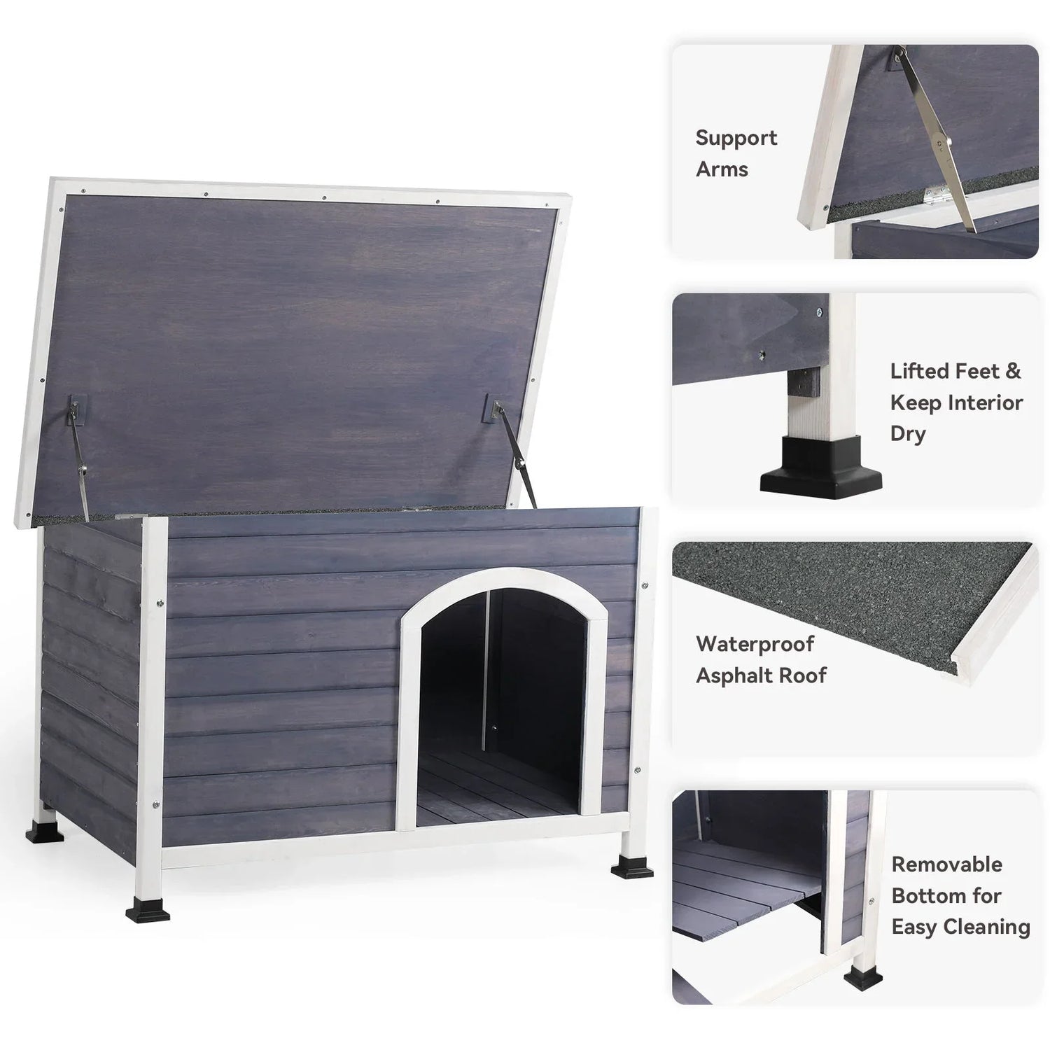 Medium Wooden Outdoor Dog House, Waterproof Roof, Elevated Floor - Gray