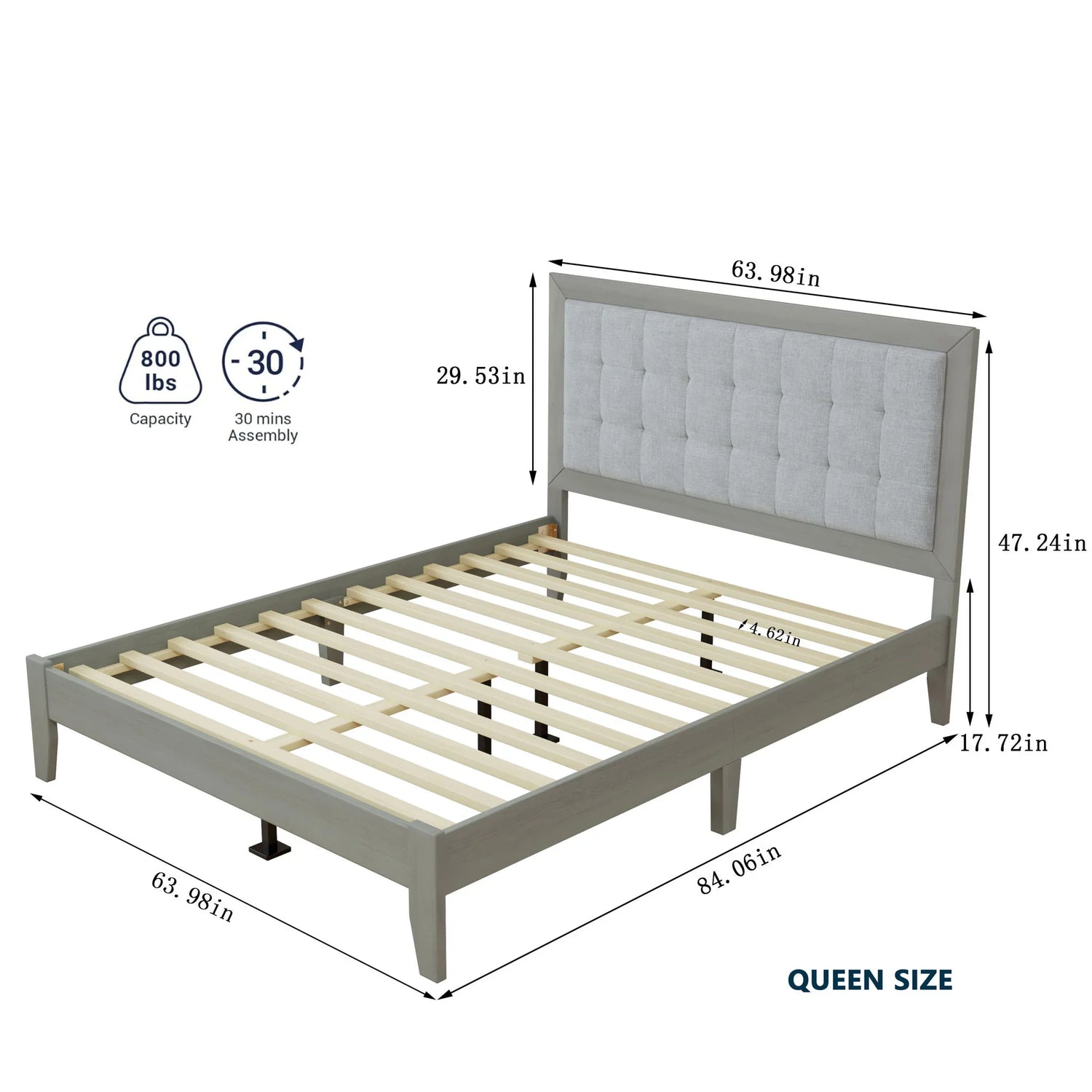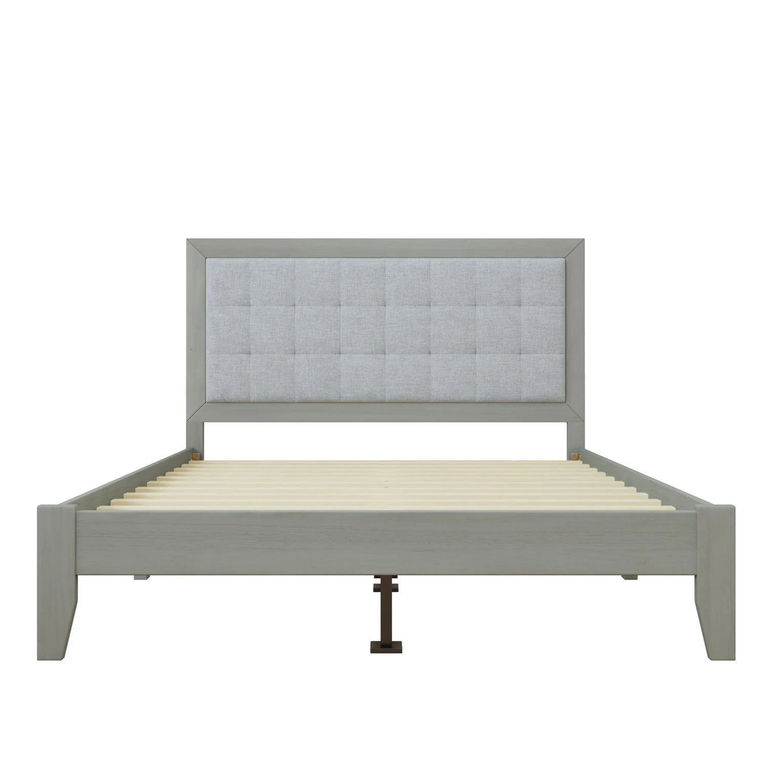 Queen Size Mid Century Modern Solid Wood Platform Bed With Upholstered Headboard - Gray