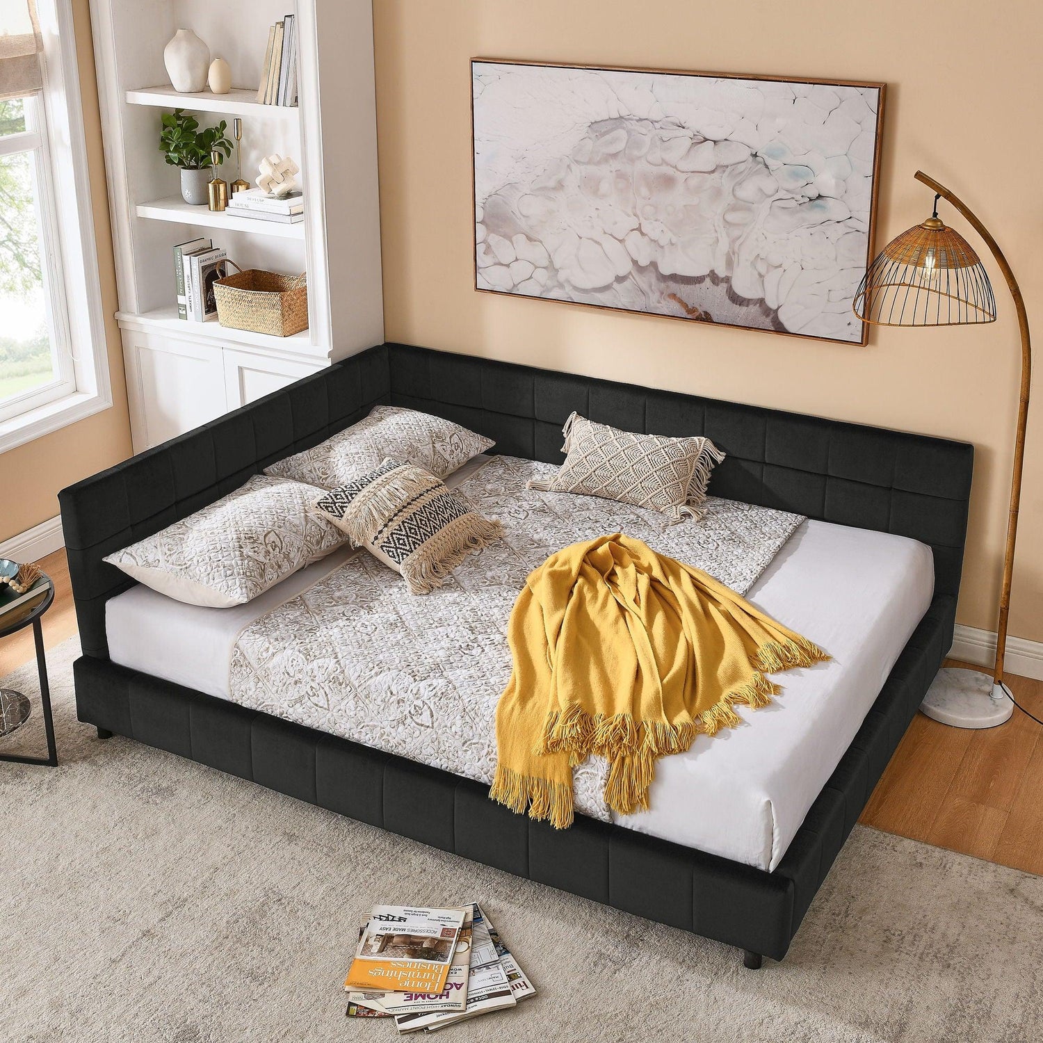 Mid-Century Storage Upholstered Tufted Bed Frame With Backrest And Armrests