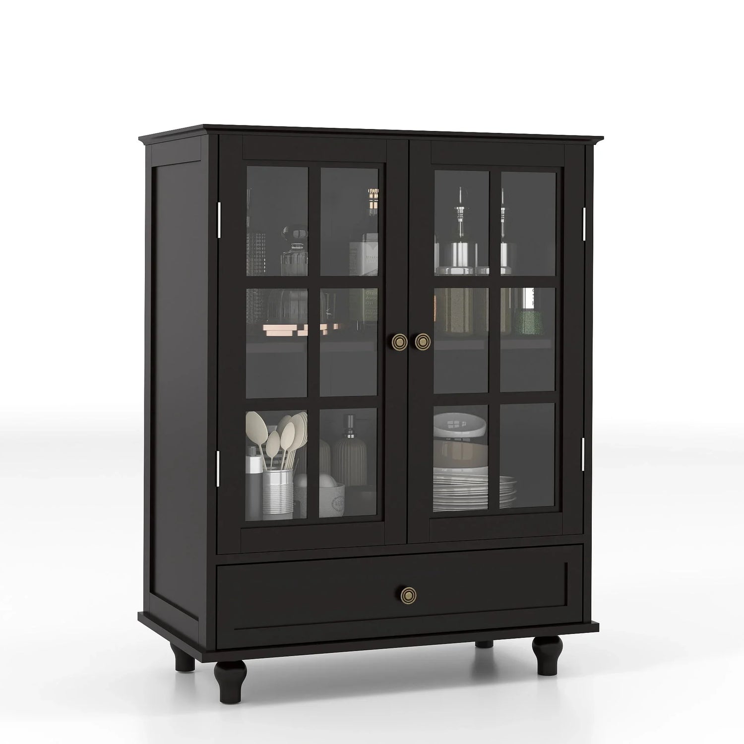 Crafted from MDF with a durable water‑based finish, the cabinet pairs a light, matte look with practical resilience against warping. Two framed glass doors with window‑pane mullions showcase contents on adjustable interior shelving, while the full‑width bottom drawer offers discreet storage for linens or serving pieces. Subtle turned feet and simple round knobs complete the refined, contemporary profile.