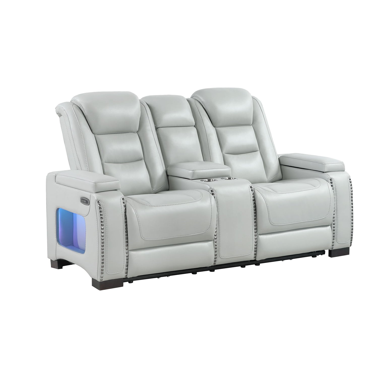 Power Console Loveseat With Power Headrest USB LED And Bookshelf Arms - Grey