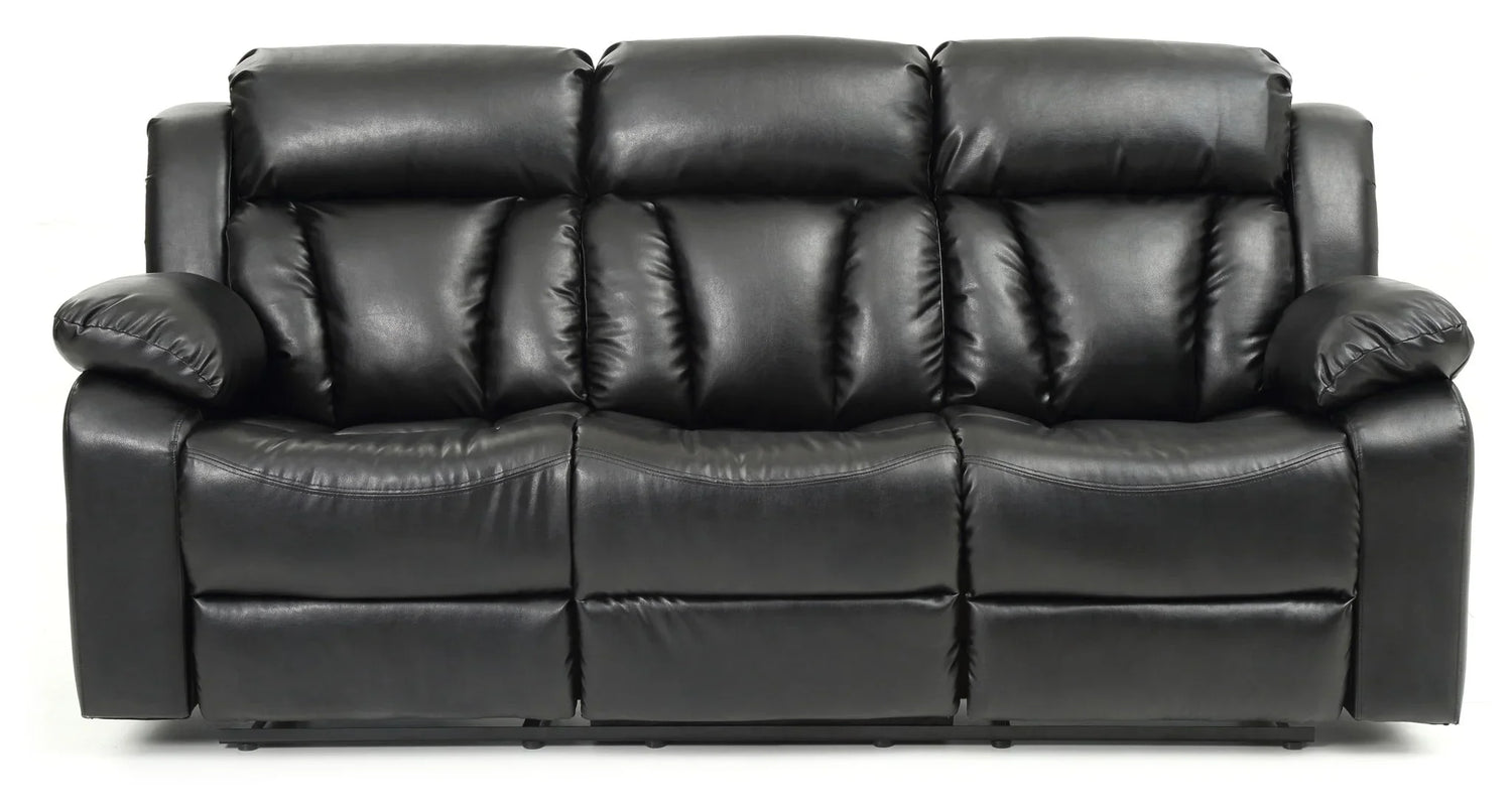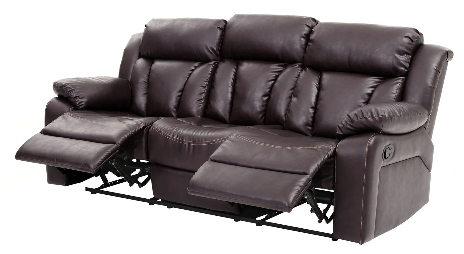 Built with a durable PU (faux leather) cover and a reinforced reclining mechanism, this sofa pairs comfort-focused construction with easy, mechanical recline operation (manual handle). The back ships detached for easier delivery and reattaches on arrival; visible features include a channel tufted back, thick seat cushions and an exposed metal recline frame when footrests are extended.