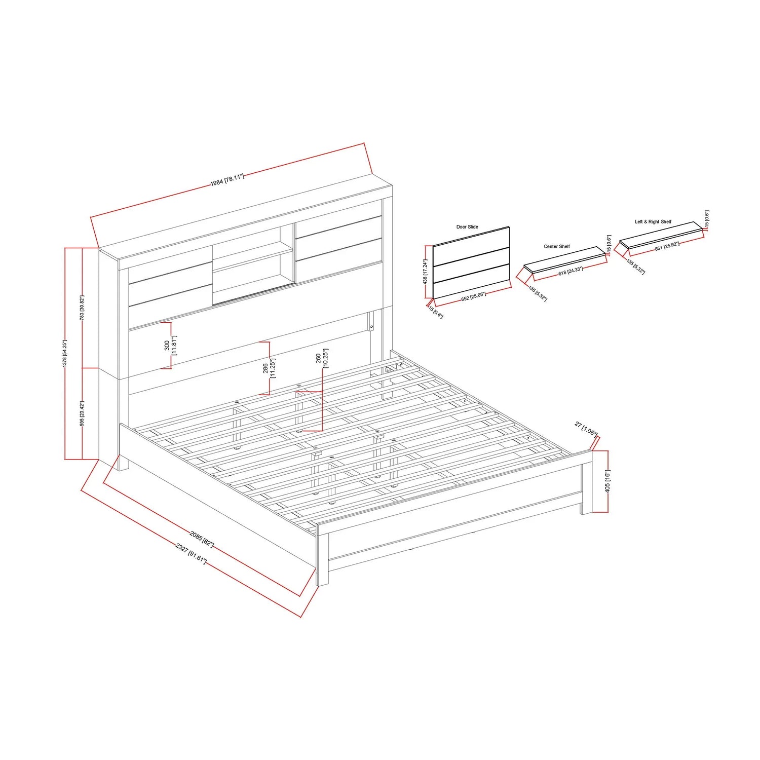 - Headboard: Built‑in bookcase for added storage (open shelving for bedside essentials).