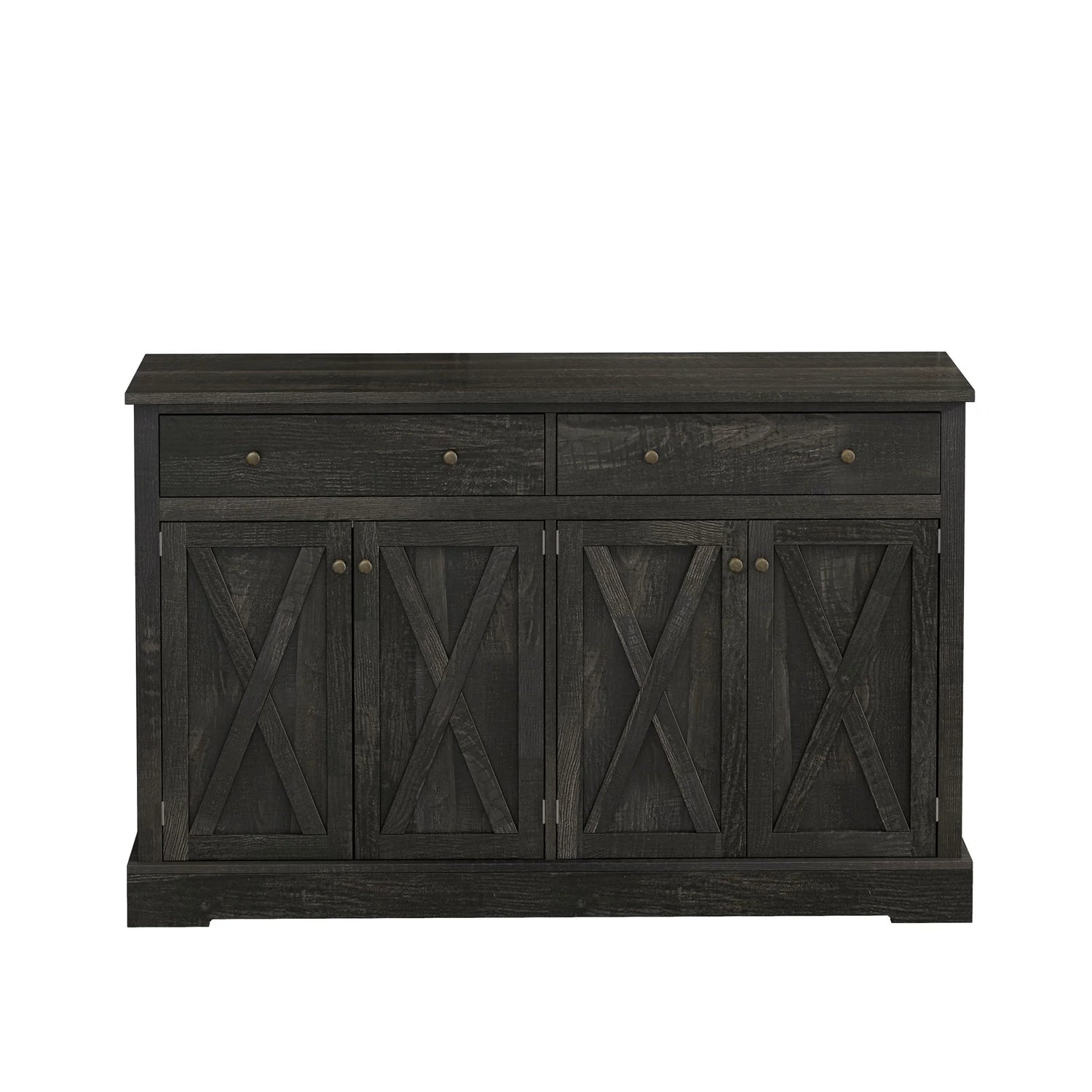 Everyday use centers on smart, concealed storage: two full‑width drawers above four cabinet doors provide space for table linens, media components, or seasonal decor. The piece shown has a deep, charcoal‑gray, weathered matte finish that emphasizes natural woodgrain texture and paired with small round metal knobs for a quietly vintage look. Screens and natural materials may show slight variation in tone and texture.